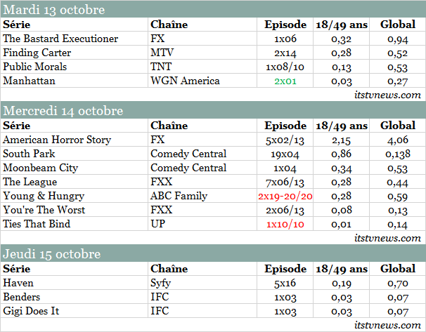 Mardi | Après avoir affiché des chiffres stables lors des semaines précédentes, The Bastard Executioner recule de 20% à seulement 0.32 pt et passe sous la barre du million en global. Salué par la critique, Manhattan ne recueille malheureusement pas les faveurs du public : le period drama est de retour avec ses plus bas résultats historiques (0.03 pt, 0.27 M). La saison 1 avait obtenu une moyenne de 0.08 pt et 0.42 million.