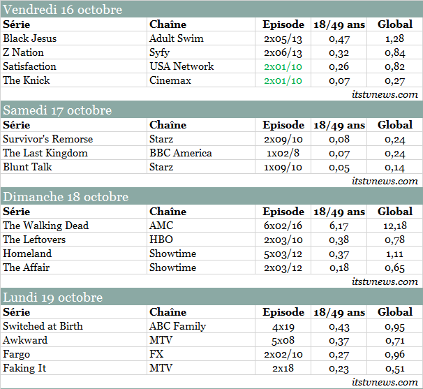 Récapitulatif des audiences du câble du vendredi 16 au lundi 19 octobre 2015 aux Etats-Unis.