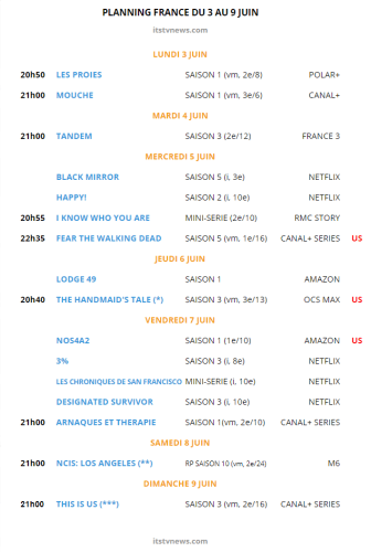 Publié 02/06/2019 - 14:45 à 635 × 945 dans Mouche, Handmaid’s Tale, Black Mirror, Tandem, Designated Survivor, FTWD… – Semaine séries France du 3 au 9 juin‘agenda-france-3-9juin2019’ ‹ Retour