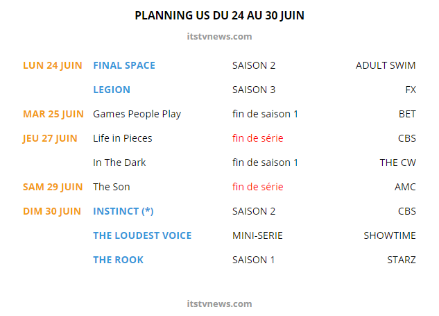 Publié 22/06/2019 - 10:55 à 633 × 455 dans Legion, The Rook, The Loudest Voice, Final Space, Instinct… – Semaine séries US/UK du 24 au 30 juin‘agenda-us-2430juin’ ‹ Retour